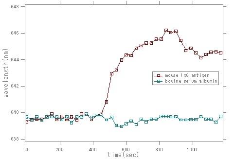 There is no response when bovine serum albumin is flowed(blue), but interaction-based shifts are obtained when mouse IgG antigens are flowed. (Fig.2)